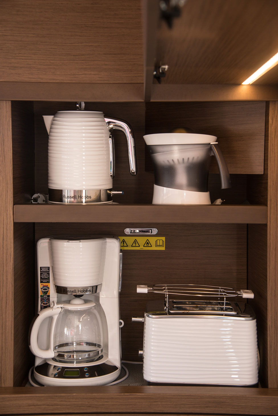 Air conditioning, refrigerators, generator, watermaker, dishwasher, coffee maker, stove, toaster, oven, microwave, ice maker, TV, navigation, sound system, lighting, WIFI, Bluetooth,